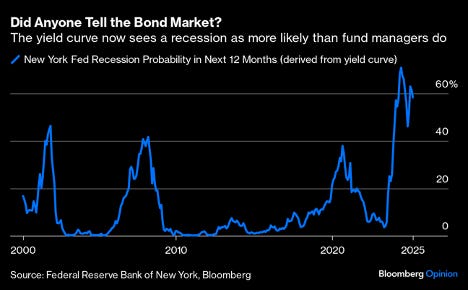 What remains very weird is that while two-thirds of fund managers now describe a recession within the next 12 months as “unlikely”, the bond market is saying the opposite. The New York Fed’s recession indicator derives the implicit chance of a recession in the next 12 months from the (still deeply inverted) yield curve and it shows a 60% bet we are headed into darker days.