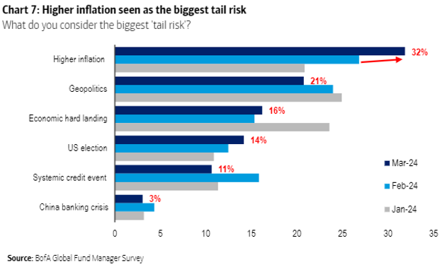 The risk to gold in these questions comes to the fore when you see things like the Bank of America Global Fund Manager Survey, which says money managers now think that the greatest risk is overheating. As you can see, inflation now leads money managers’ risk list, taking over from Economic Hard Landing and Geopolitics.